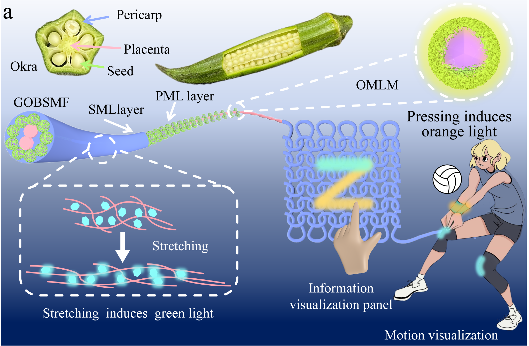 近日,我校功能性纺织材料及制品教育部重点实验室樊威教授团队在材料领域顶刊Advanced Materials发表题为“用于视觉信号传输的仿秋葵结构绿-橙双色切换力致发光纤维”(Green-Orange Bi-color Switchable Mechanoluminescent Fiber of Okra-Like Structure for Visual Signaling)的研究论文。该研究受自然界中秋葵独特的多层结构启发,巧妙地模仿了秋葵的“胎座”“子房室”“种子”和“果皮”结构:以弹性PDMS纱线为柔性支撑...