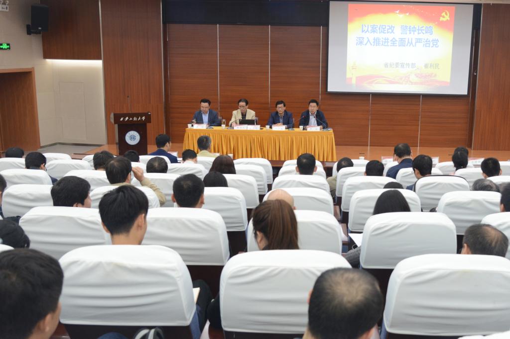 9月19日下午,我校在临潼校区图书馆二楼报告厅召开“以案促改”警示教育大会。会议邀请省纪委宣传部部长崔利民作题为《以案促改警钟长鸣深入推进全面从严治党》的专题报告。校党委书记刘江南作讲话。会议由校纪委书记井浩主持。校领导,校党委委员,校纪委委员,校学术委员会委员,各院(部)教授委员会委员,各院(部)系主任,科级以上干部共240余人参加了会议。