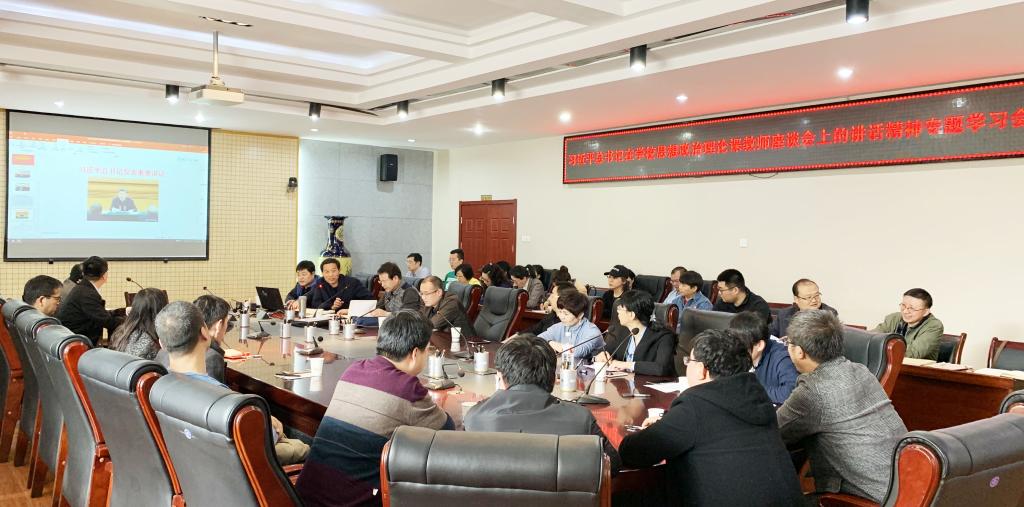 3月20日下午,马克思主义学院组织全体教职工在金花校区第三会议室举办了“习近平总书记在学校思想政治理论课教师座谈会上重要讲话”专题学习会。会议由马克思主义学院院长王志刚主持。学院教师集体观看了3月18日习近平总书记主持召开学校思想政治理论课教师座谈会并发表重要讲话的视频。王志刚院长从亲切关怀、肯定信任、准确定位、高度重视、明确方向、实践遵循、保障机制七个方面对座谈会总书记讲话精神进行了全面系统地领学...