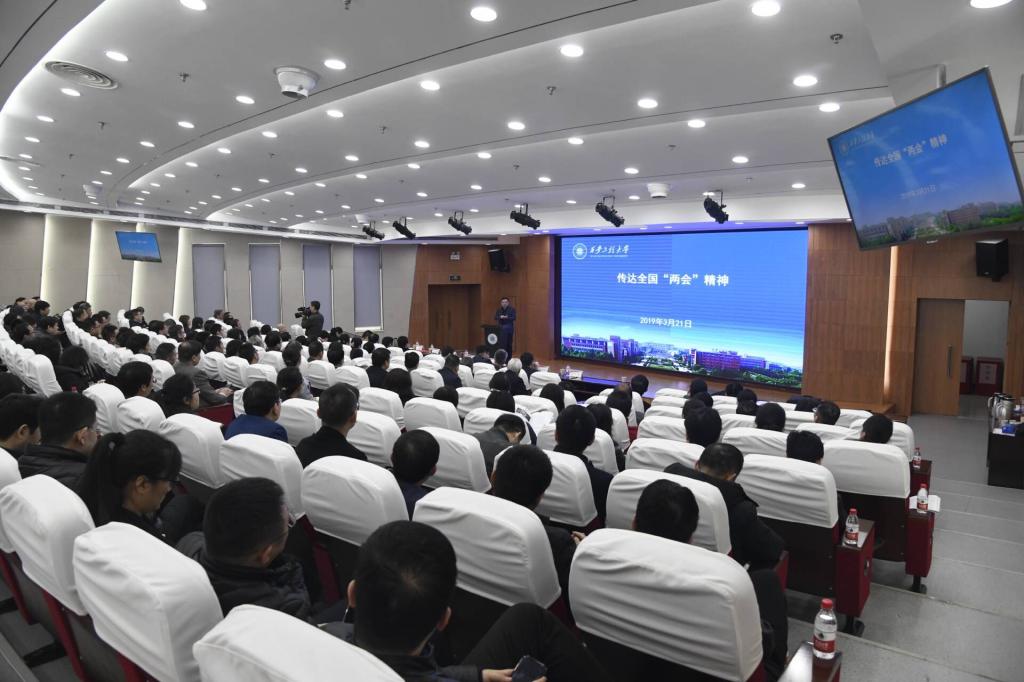 3月21日上午,我校在临潼校区图书馆一楼报告厅召开“两会”精神传达学习会。全国人大代表、我校校长高岭做了2019年全国“两会”精神传达学习报告。3月5日至15日前后,全国人大代表、我校校长高岭在北京认真履职,充分发挥代表作用,积极为西部高等教育发展呐喊助力。“两会”归来,高岭即刻总结两会的见闻、心得和学习成果,全面系统地将“两会”精神向我校教职工进行传达。他从“两会”现场的感受入手,向大家具体介绍了“两会...