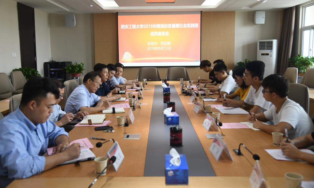 9月12日下午,我校在临潼校区22-8楼226会议室召开西安工程大学2019年精准扶贫暑期社会实践团成员座谈会。校党委副书记朱君强、扶贫办及校团委等相关单位负责人和2019年我校暑期赴紫阳、延长、志丹、临潼社会实践团队带队教师与学生代表参加座谈。座谈会由校团委书记王晓先主持。扶贫办主任赵振华首先介绍了我校“双百工程”、“驻村联户”等扶贫工作的基本情况,详细介绍了学校在帮扶延长、临潼、紫阳和志丹所开展的系列帮扶举...