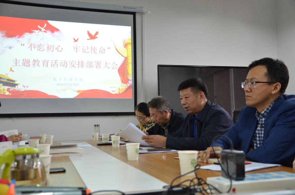 2019年9月19日,电子信息学院在电信楼302会议室召开“不忘初心,牢记使命”主题教育活动安排部署大会。学院党政领导、党委委员和全体支部书记参加了会议,联系校领导朱永民副校长参加并作讲话,会议由学院党委书记杨恩科主持。会上,杨恩科首先宣读了《西安工程大学关于开展第二批“不忘初心、牢记使命”主题教育的实施方案》,对我校此次主题教育活动的目标要求和具体安排做了详细的传达。接着,杨恩科结合学校的总体要求就学...