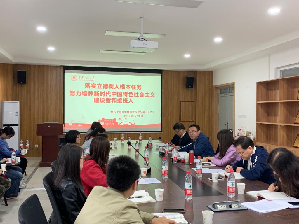 10月8日上午,高岭校长参加主题为“落实立德树人根本任务,努力培养新时代中国特色社会主义建设者和接班人”的环化学院党委理论学习中心组(扩大)会议。参加会议的有环化学院党委理论学习中心组成员、各系主任、近两年新进青年博士和在岗取得博士学位的青年教师,会议由环化学院党委书记李建学主持。首先,大家一同观看了习近平在全国教育大会上发表的重要讲话视频,回顾了习总书记对教育工作提出的新要求。学院三位处级干部李...