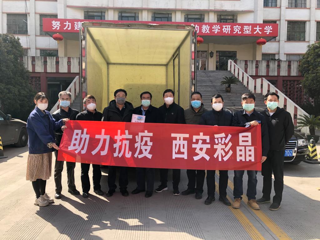 在新冠肺炎疫情防控工作的决胜时刻,经纺织科学与工程学院联系,西安彩晶光电科技股份有限公司向我校捐赠过氧乙酸消毒液。3月17日上午,西安彩晶光电科技股份有限公司将抗疫物资送达我校金花校区,我校副校长、防控工作领导小组副组长李鹏飞、殷永建代表学校接收了捐赠物资。李鹏飞向西安彩晶光电科技股份有限公司人力资源总监赵峰颁发了捐赠证书,并对企业支持学校防疫工作表示真挚感谢。他希望双方继续加强联系,疫情结束后,...