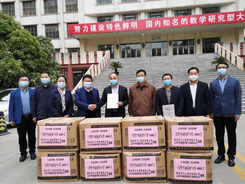 爱心温暖工程大,善举彰显真感情。随着新冠肺炎疫情防控工作进入外防输入、内防反弹的阶段,我省学校复学工作有序开展,学校抗“疫”工作受到社会各界关注。经学校科技成果转化中心联系,潍坊市九久家纺有限公司、山东中科恒源环境工程有限公司向我校捐赠一批防护口罩。4月17日下午,潍坊市九久家纺有限公司董事长陈亦恩、山东中科恒源环境工程有限公司董事长兼总经理张守健(我校95级环工专业校友)一行将防护口罩送达我校金花...