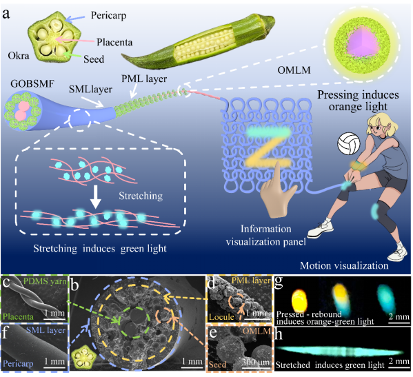 该研究受自然界中秋葵独特的多层结构启发,巧妙地模仿了秋葵的“胎座”“子房室”“种子”和“果皮”结构:以弹性PDMS纱线为柔性支撑核心(模拟胎座),在其表面规律性地附着橙色力致发光微珠(模拟种子,受压发橙光),外层再包覆一层绿色力致发光复合材料(模拟果皮,受拉发绿光)。这种独特的类秋葵仿生结构,成功解决了传统纤维材料难以兼顾弹性与刚性、无法实现双应力模式响应与双色发光的难题。