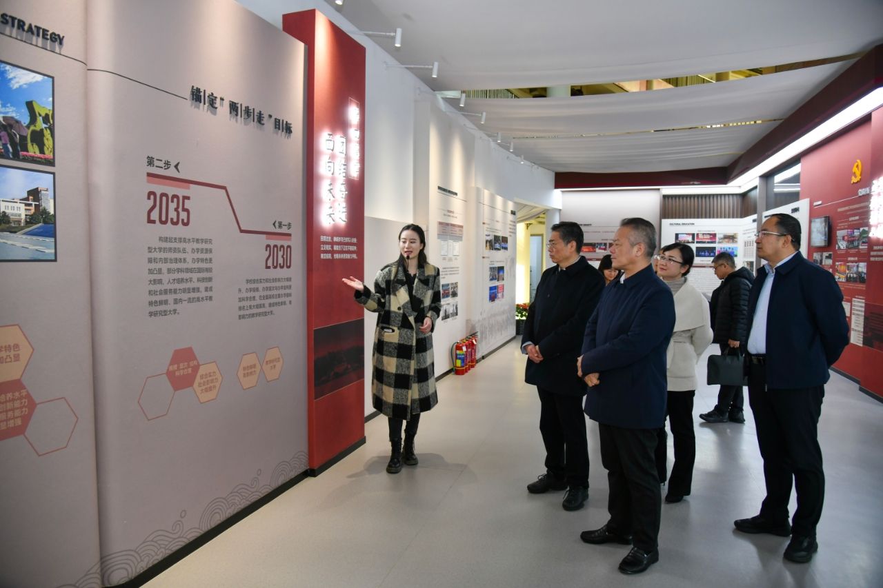 赵国宏一行参观了我校校史馆、纺织服装博物馆,进一步了解了学校的办学历史、育人成效和各类成果和未来规划。在图书馆经纬阁,通过各类馆藏文献对学校始终坚持内涵发展,服务行业和区域情况有了更深认识。在电子信息学院实验室,考察了科研人员在新能源材料、智能电网等前沿技术方面的创新成果。