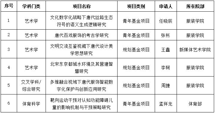 近日,教育部社科司发布2025年度教育部人文社会科学研究一般项目立项通知,我校共有6个项目获得立项,包括艺术学项目4项、艺术学交叉学科项目1项、体育科学项目1项。立项总数在全国纺织专业高校中名列前茅,尤其在艺术学学科方面表现突出,立项数量位列全国纺织类高校第一、全国高校中并列第二,充分体现了我校在艺术学领域的学科优势与科研实力。