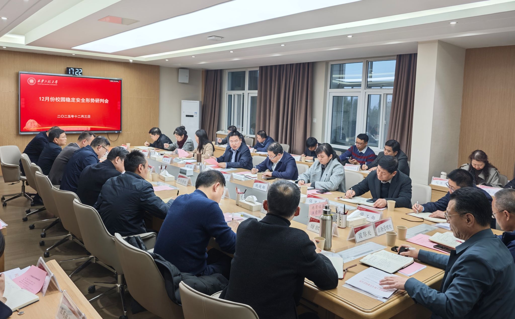 会上,稳定办传达了近期上级稳定安全工作相关文件精神和学校党委会关于稳定安全工作的部署,汇报了近期重点工作和相关制度建设情况。保卫部、宣传部、学工部、资产与实验室管理处、后勤管理处、国际处等职能部门负责人先后汇报了近期涉及稳定安全方面的工作情况、存在的风险隐患及下一步工作思路。