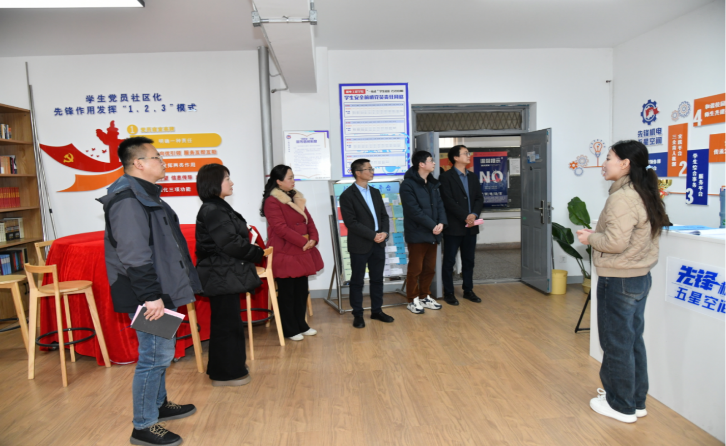 座谈结束后,周慧娟一行实地走访了我校“一站式”师生服务中心·校警共建警务室、“一站式”数智新“+”教育部辅导员名师工作室和“先锋机电·五星空间”“笃行相伴·爱在管苑”等社区育人阵地,并就相关工作进一步深入交流。