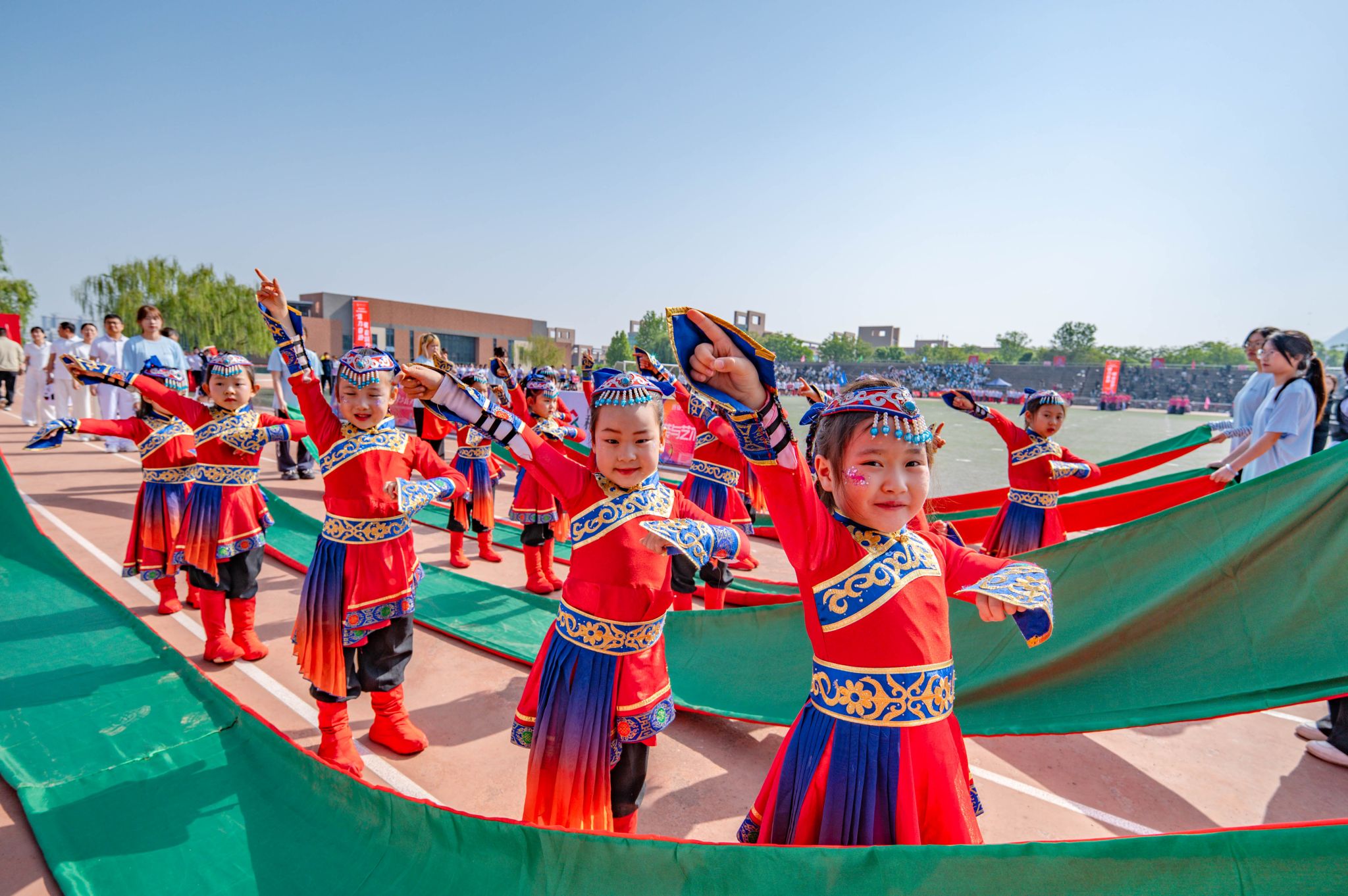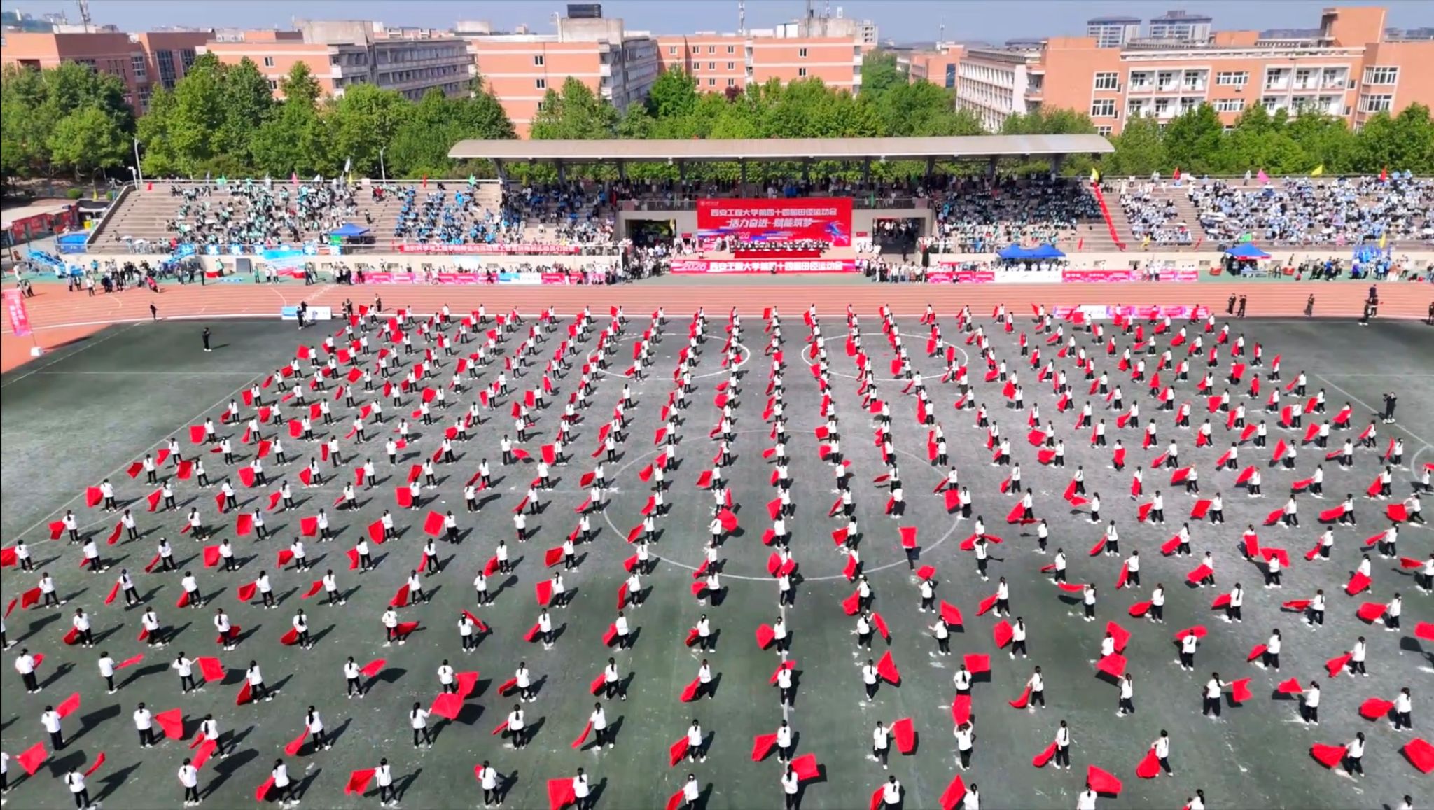 国家级裁判、体育部教师蒋兵,校男子100米纪录保持者、网络安全学院党总支副书记刘许,陕西省第43届大学生运动会女子跳远冠军、跳高亚军、服装与艺术设计学院学生汤三洋子分别作为裁判员、教工运动员和学生运动员代表宣誓。开幕式上还进行了精彩的大型文体表演。在团体操表演环节,幼儿园的小朋友们在老师和家长的带领下共同表演了《草原小骏马》,亲子间配合默契,赛场上温馨气氛弥漫;600名青年学生带来青春洋溢节目,啦啦操、健身瑜伽和旗操三大项目轮番登场,将开幕式的气氛推向高潮。