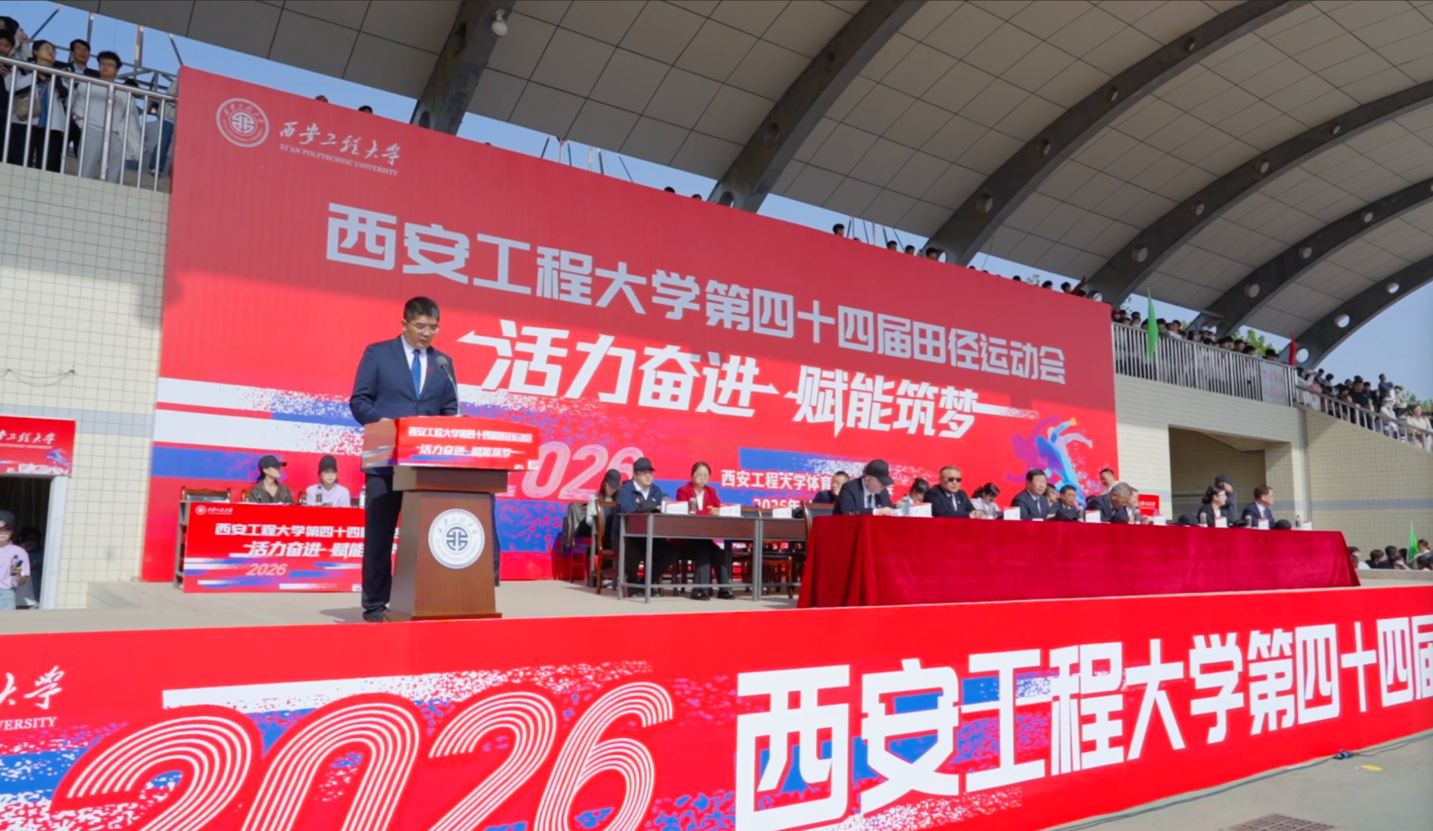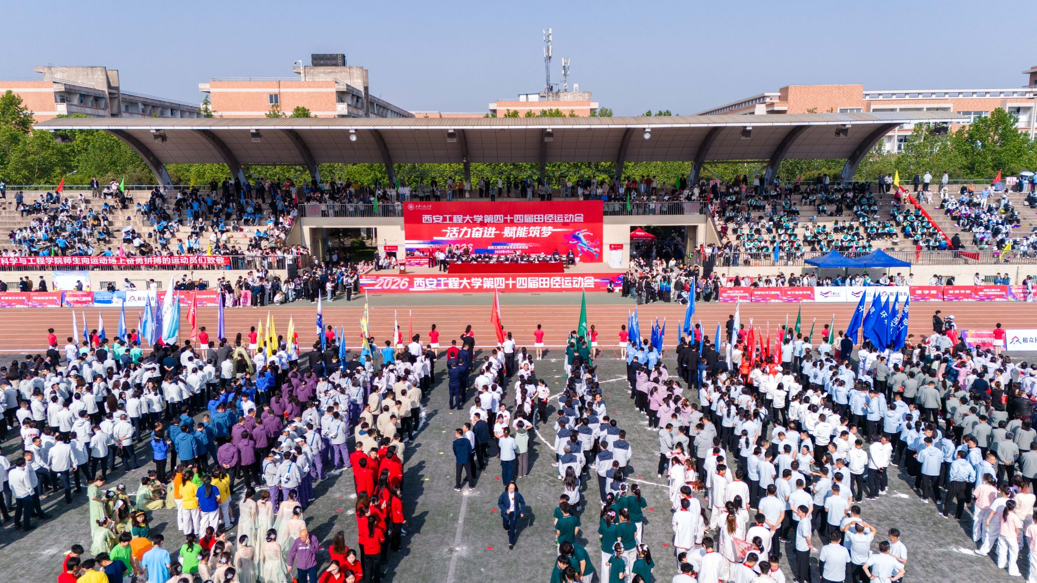 4月23日至24日,我校第44届田径运动会在临潼校区骊风体育场举行。本届运动会以“活力奋进 赋能筑梦”为主题,充分展现了全校师生团结拼搏、昂扬向上的精神风貌。校领导张志昌、张晓晖、殷永建、戴鸿、夏蔡娟、杨建、张洛红出席开幕式。校党委书记张志昌宣布比赛开始,校长张晓晖致开幕词,校党委副书记殷永建、副校长戴鸿分别主持开、闭幕式。