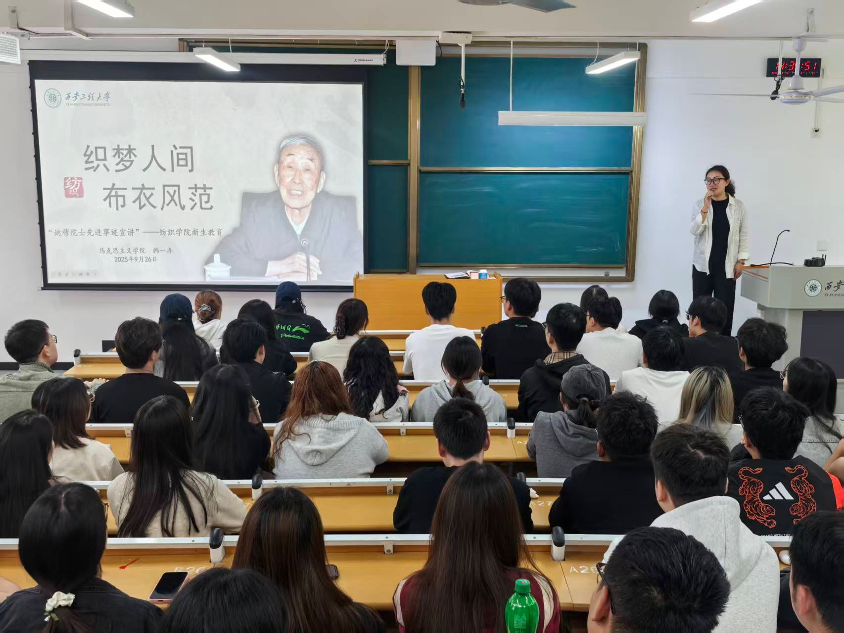9月26日,纺织科学与工程学院特邀姚穆院士先进事迹宣讲团成员、马克思主义学院韩一冉,为2025级全体研究生开展“织梦人间,布衣风范”主题宣讲活动。