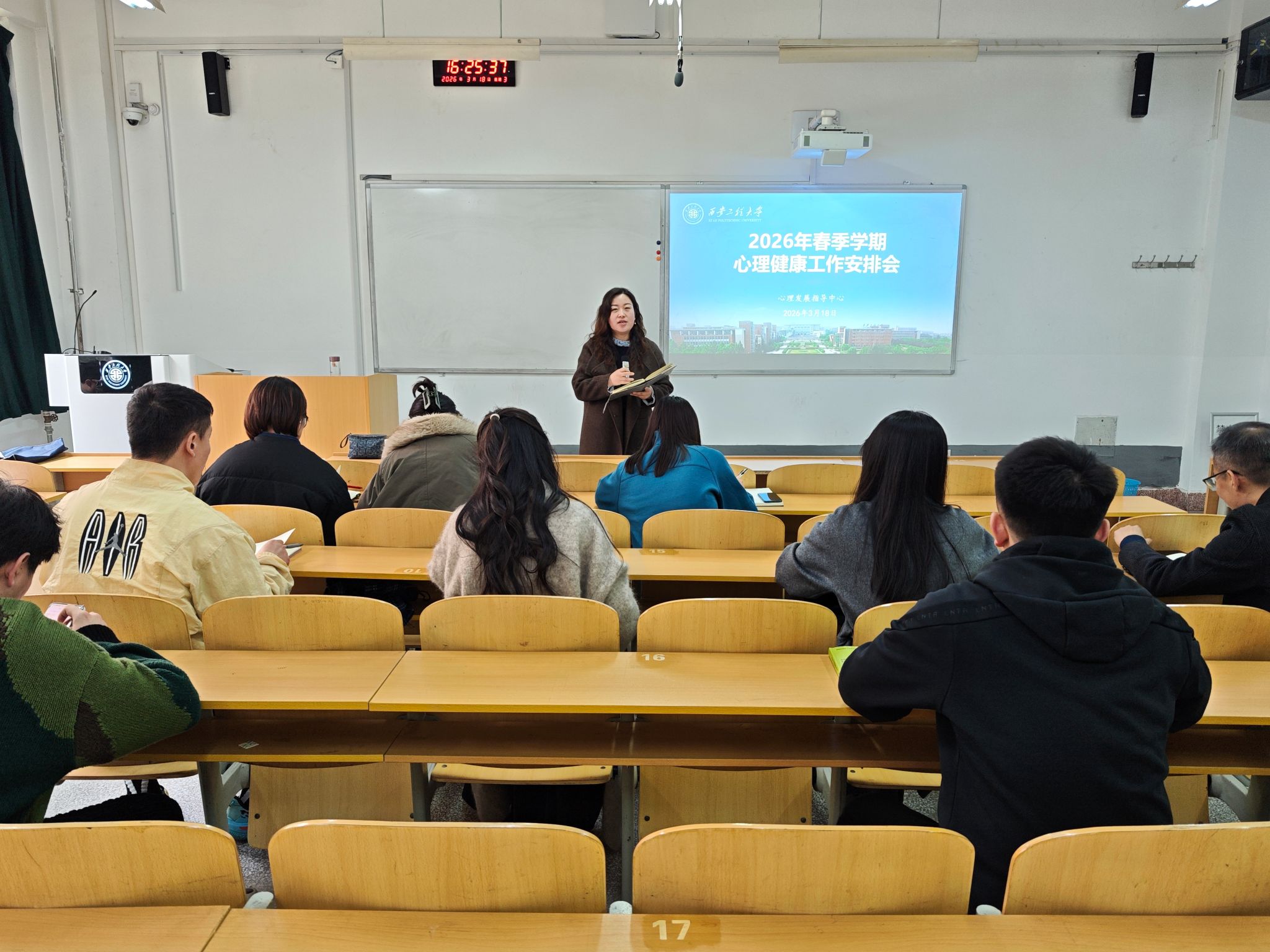 会上,学生工作部(处)心理发展指导中心对2026年春季学期工作要点进行解读,要求一是要对标国家级、省级示范中心建设和“一站式”学生社区建设要求,加强二级心理辅导站规范化建设,完善校院联动,提升前端预警与服务能力;二是深化课程改革,推进校本教材建设,提升课程育人实效;三是组织开展心理健康教育课程教学展示活动、班级心理委员成长训练营等活动,支持各学院打造“一院一品”特色品牌,着力培育学生积极心理品质;四是加强心理危机预防与应急响应能力,督促各学院辅导员常态化开展学生心理状况排查,切实筑牢校园心理安全底线。