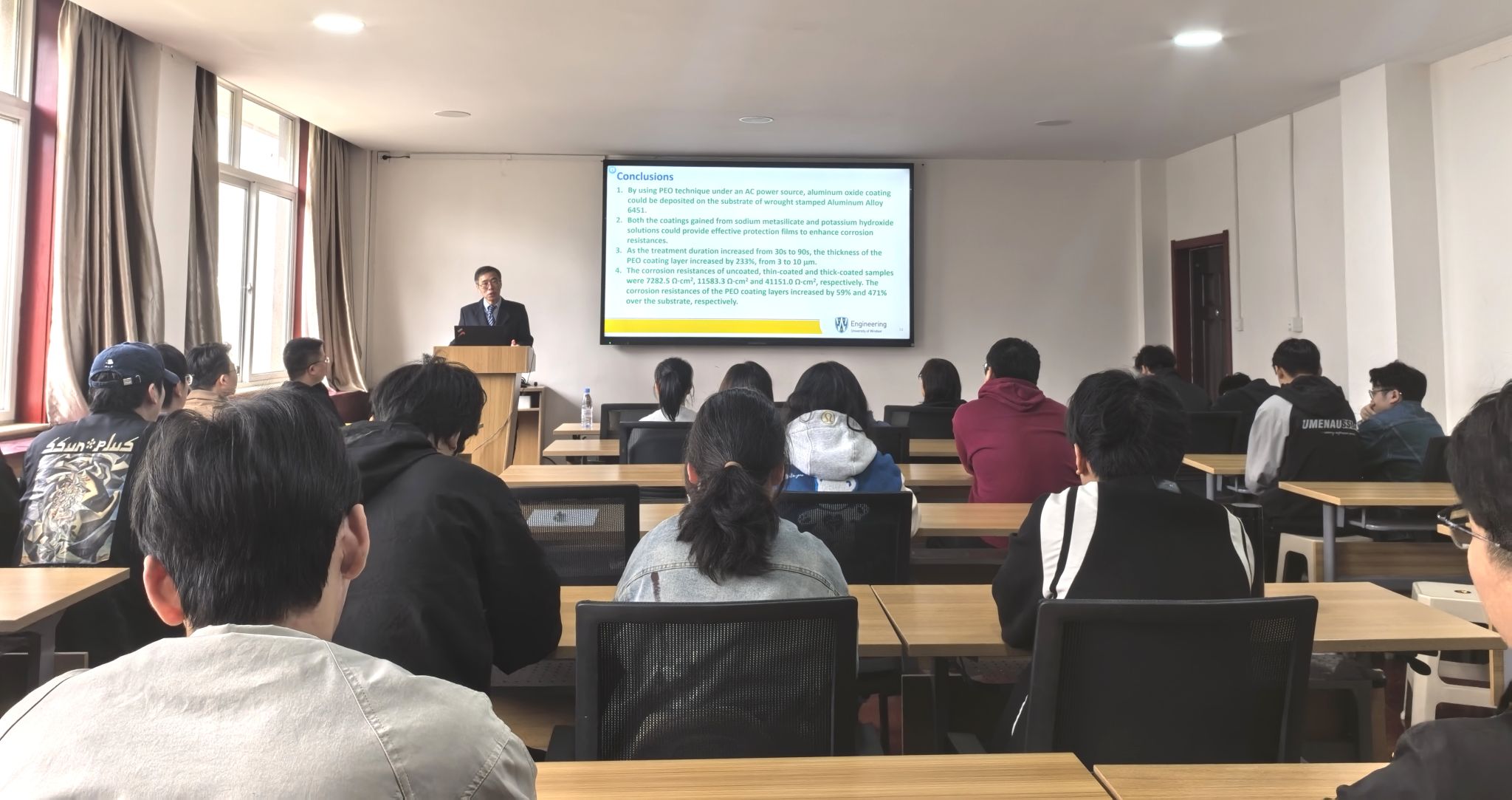 聘任仪式结束后,胡宏发教授作了题为“PEO涂层对锻造冲压6451铝合金耐蚀性的影响”(Effect of PEO Coating on Corrosion Resistance of Wrought Stamped Aluminum Alloy 6451)的专题报告。他结合自身科研实践分享了铝合金抗腐蚀涂层在汽车领域的研究进展,整场讲座脉络清晰、内容丰富,开拓了学院教师及研究生的视野。